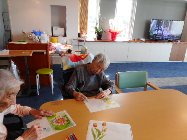 「お花に色を塗りましょう」「いいねえ。やってみるか」