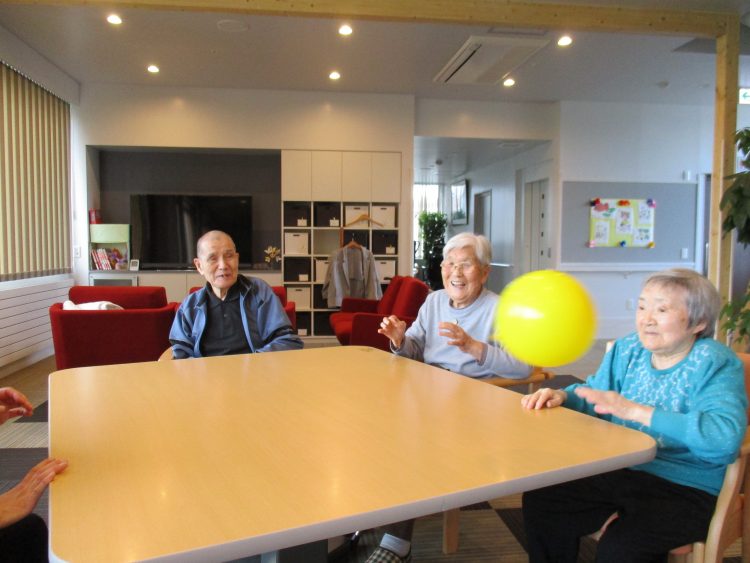 ブログをご覧の皆様こんにちは!^-^!今日は職員も加わり風船バレーを行いました^-^!始めは風船を2つ使用してみました。「何処を見ていいかわからねーじゃー」・「それー、よいしょのしょ」と身を乗り出して風船を追いかける方もいて皆さん夢中です^-^