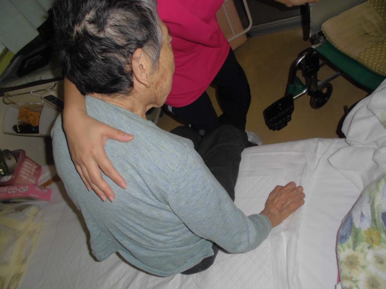 夜勤職員だけでなく、早番職員も出勤し起床のお手伝いをしていきます。K様は朝から元気そうな表情をされておられました。