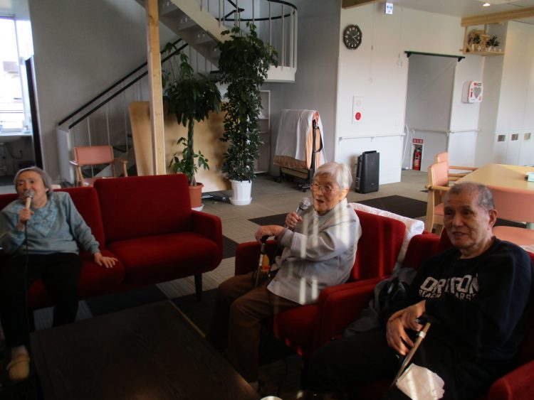 こちらは、カラオケを行っている様子です♪「氷雨」「北国の春」等歌いました♪途中、笑い声も聞こえ、盛り上がりました♪