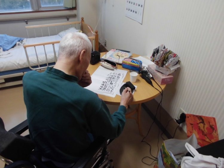 ブログをご覧の皆様こんにちは。朝整容後居室にてT様が書道を真剣な表情で取り組んでおられました。声掛けすると「書いてると落ち着くんだよ」と話されておりました。