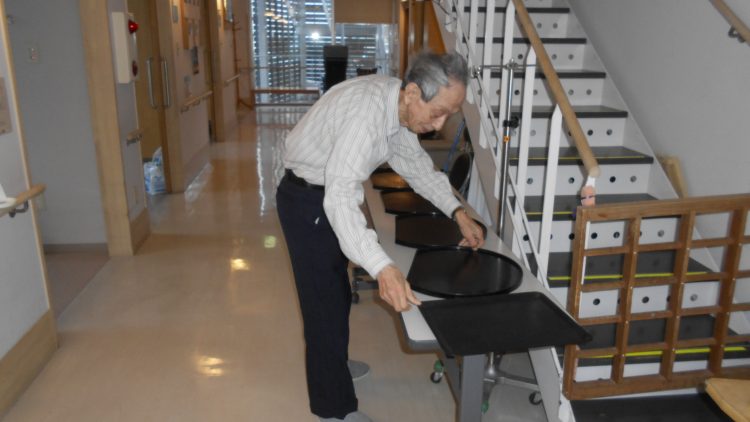 I様です。昼食時にお盆を並べて頂きました。