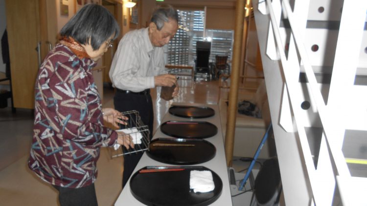お盆や箸、おしぼりなどを並べて、置いて準備して