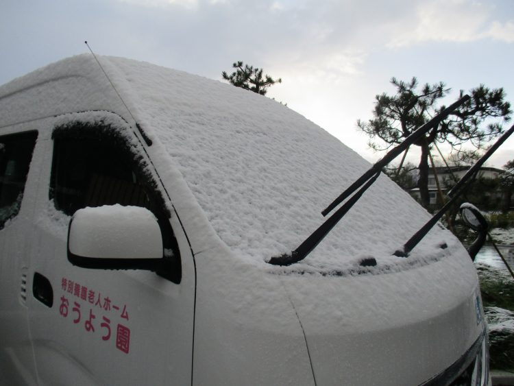 当園の送迎車も雪に覆われ、暖気運転で車内を温めてお客様を迎えます。