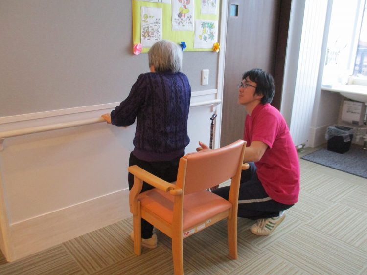 S様は歩行練習が終わると次に椅子からの立ち上がりを行っておりました。1・2・・とゆっくりゆっくり行いN介護士の見守りもあり安心ですね!^-^!