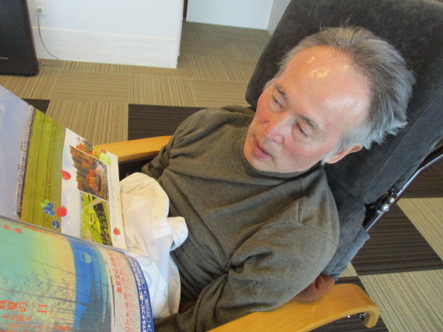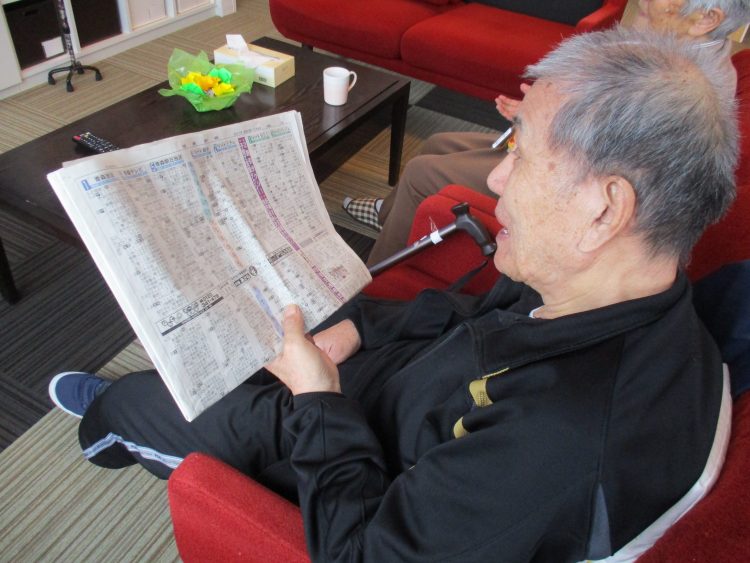 S様、新聞を見ている様子です。前の新聞記事から、今日のニュースまで、隅々まで読んでおります。