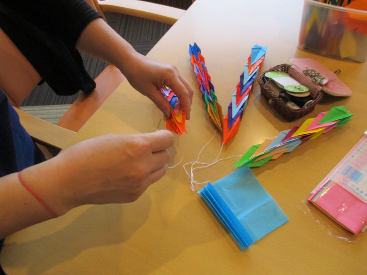 本日は、以前も紹介させていただいた千羽鶴を完成させようと職員とお客様で頑張りました♪