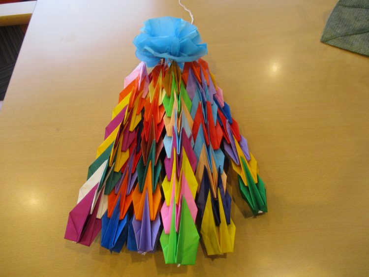 折った鶴を重ねていくのですがT様は「なんだか上手くできないよ~」と話され職員が手伝い綺麗に出来上がりました!
