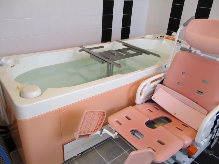 こちらは、ストレッチャータイプの機械浴となります。寝たきりの方や、リクライニングや車椅子を使用されている方(一人では座位が上手く保てない方)等が入浴出来ます。