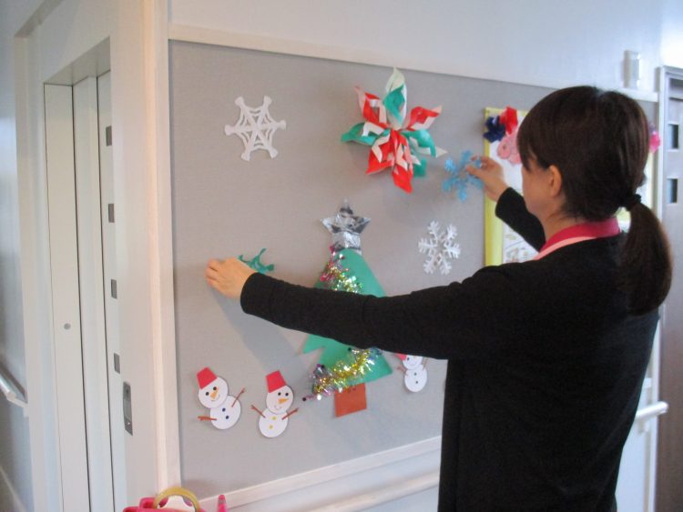 さて、本日はホールにある掲示板に、クリスマスの飾りをしている場面をご覧頂きたいと思います。