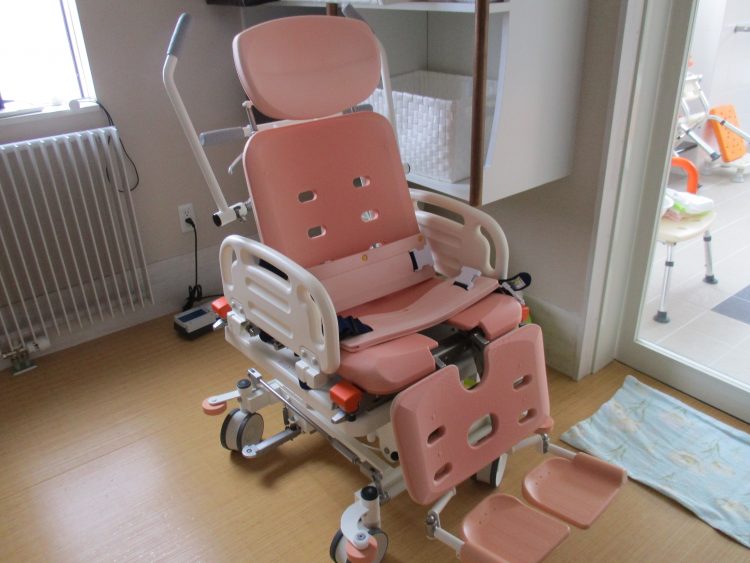 椅子の部分が上下、座っている状態から臥床されている状態へとお客様に合わせられ、車椅子や、ベッドからの移乗が出来ます。
