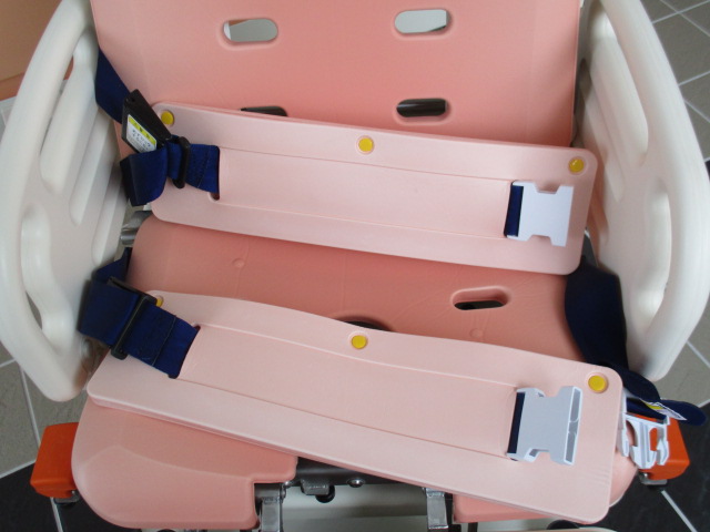 幅広の柔らかい安全ベルトは胸と腰に。お客様の体型に合わせ調節可能。小柄で入浴の際体が浮いてしまう心配が無く、安全安楽に入浴が出来ます。