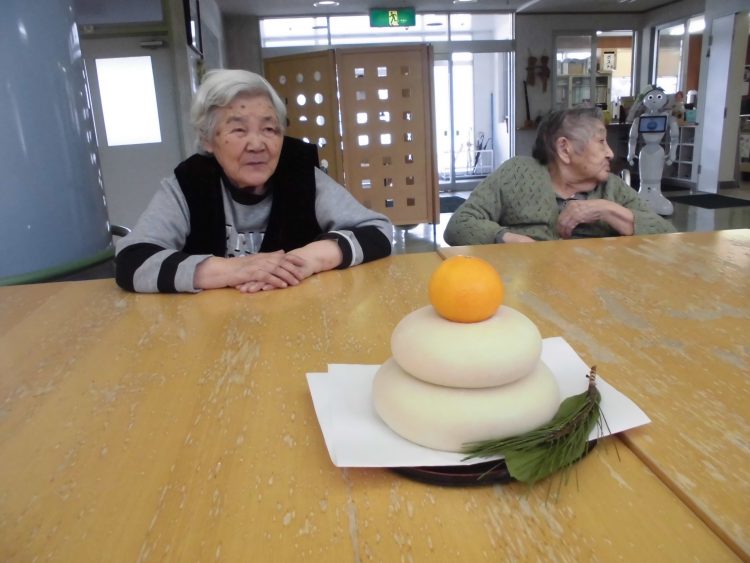 今日はお昼ご飯をお腹いっぱい召し上がったあと、ホールでゆったりとお茶会に参加しているお客様が鏡餅をみて談笑しておられました。