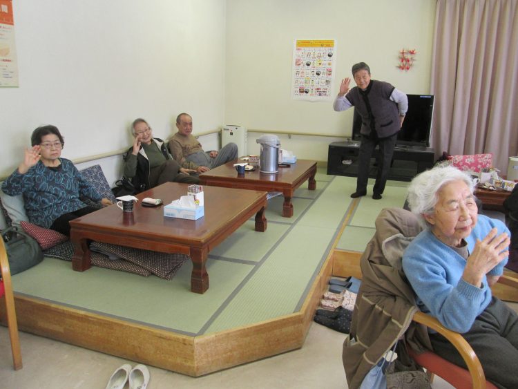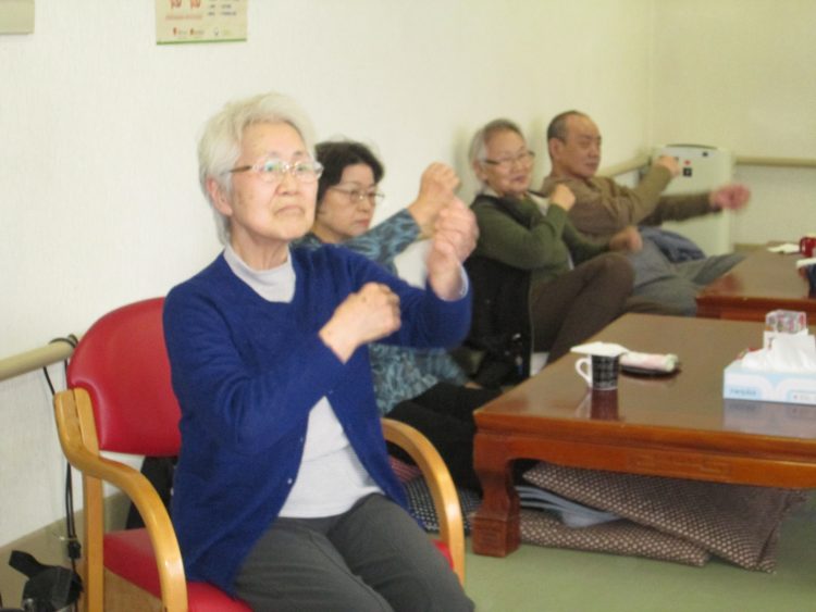 午後の集団体操の様子です。今日はラジオ体操を行った後、歌謡曲に合わせての体操を3曲行いました。皆様お馴染みの歌ですが、音楽に合わせて体を動かすのは新鮮なようで、楽しみながら行っておりました。