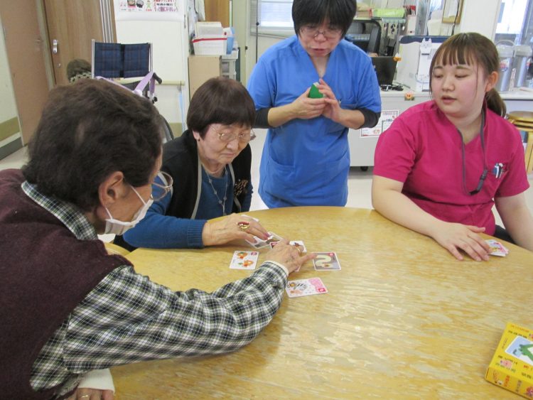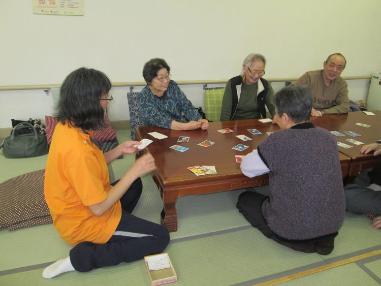 隣りのテーブルではカルタを行いました。1回目は普通のカルタでしたが、2回目となると裏返し読んだ文字を当てるという風にアレンジしながら楽しんでおりました。「せーの」で一斉にカルタを選び、「せーの」で一斉にめくり当たった人がもらっておりましたが、それも難しく・・・。