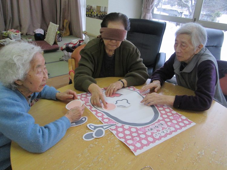 その後は正月遊びを行いました。それぞれのテーブルで福笑い・カルタ・お手玉を行いました。