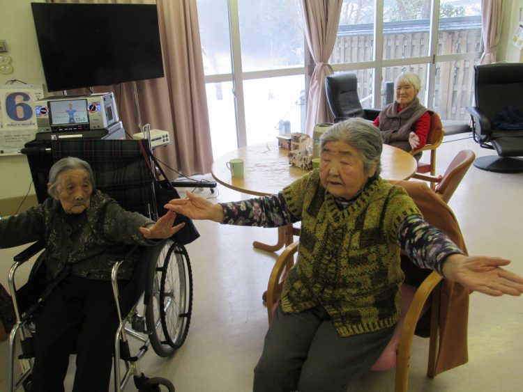 足のマッサージ、気持ちい~い!体操時間で~す。歌に合わせて腕・肩を動かしましょう。間違い探し、8個全部探せるかな?