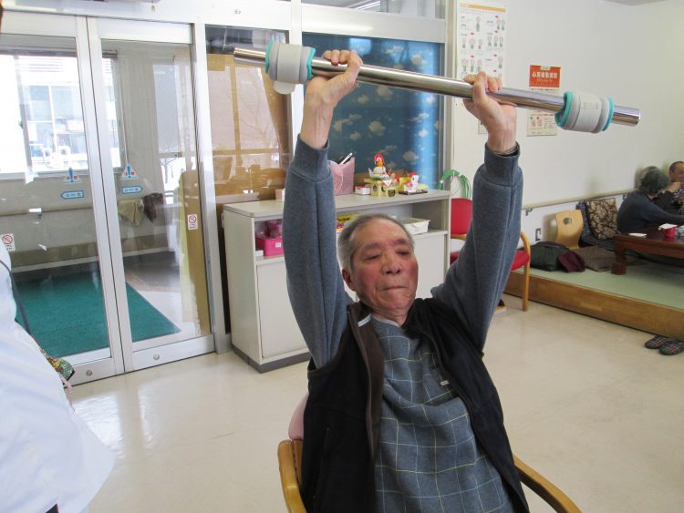 重り(負荷)をかけた棒を持ち上げる=上肢の筋力確認、筋力強化