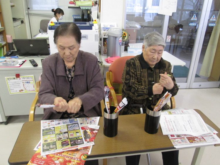 今日は筋力運動を行いました。今回は10枚のチラシを1枚ずつ丸め、ねじり缶の中に入れるというものを行いました。