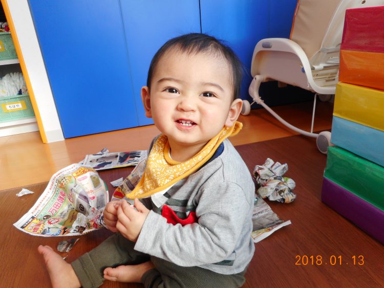 広告紙をビリビリ破いてごきげんのSくん!とっても楽しそうですね^^