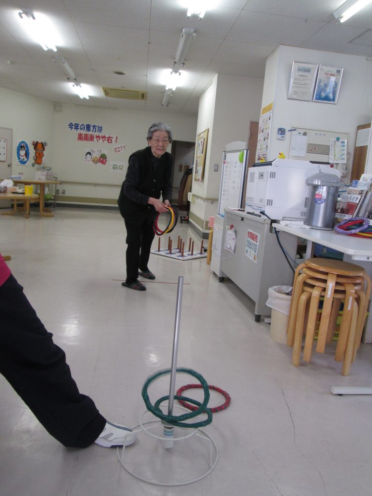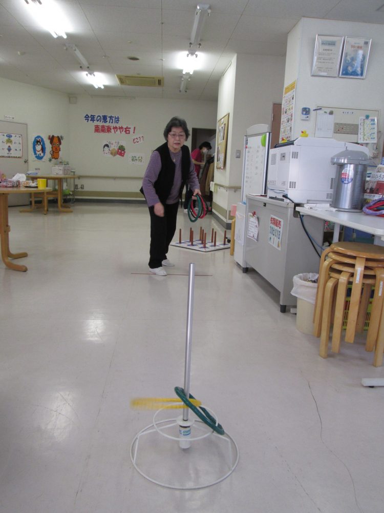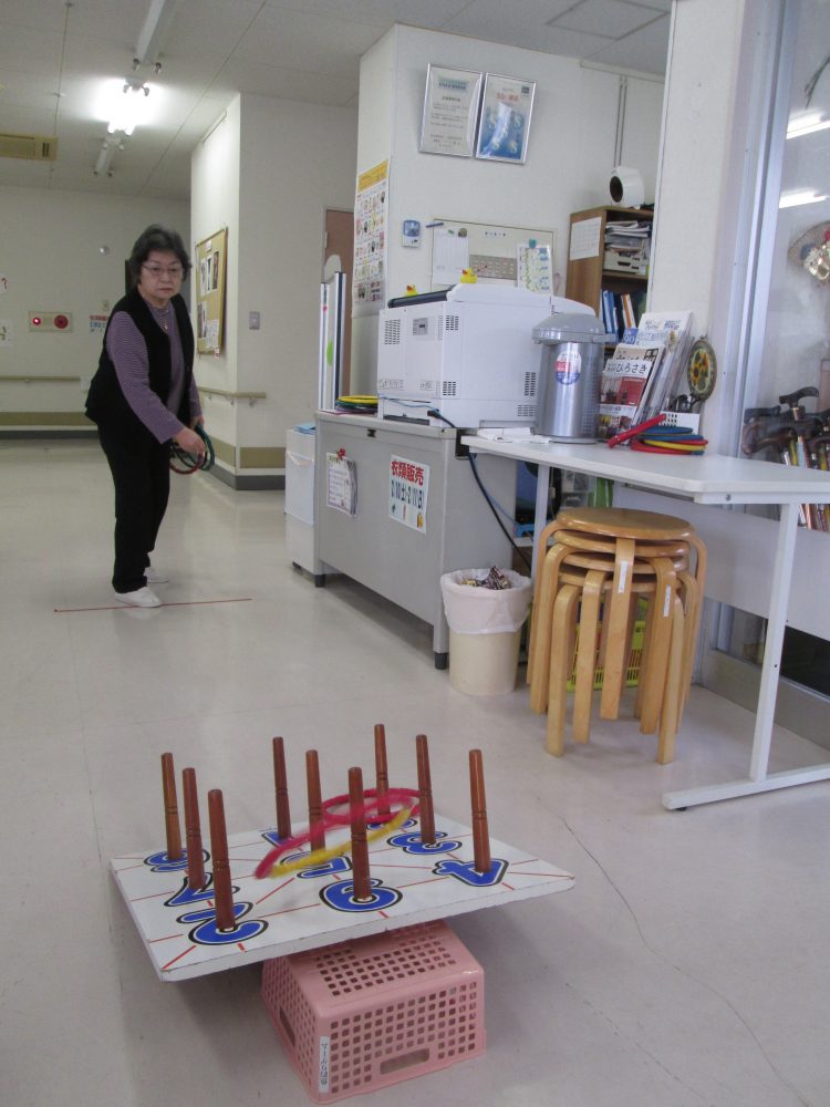 懐かしい輪投げで今日は何個の輪が入るか勝負!