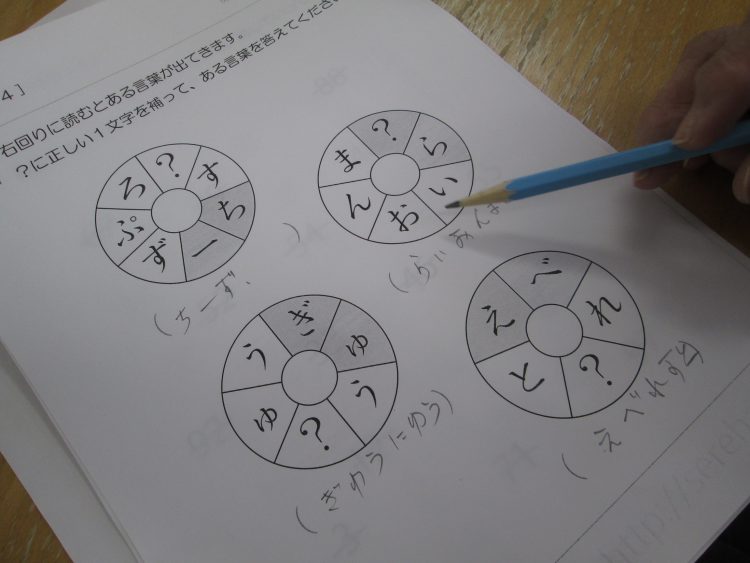 例えば、輪の中の平仮名を読むと、ある言葉が・・・えべれすと、ぎゅうにゅうまでは、皆さん出てきますが、ちーず・・・?らいおんまん・・・?みんな同じ答えが。ちなみに、正解は・・・プロセスチーズ。マーライオン。なかなか思いつきません!
