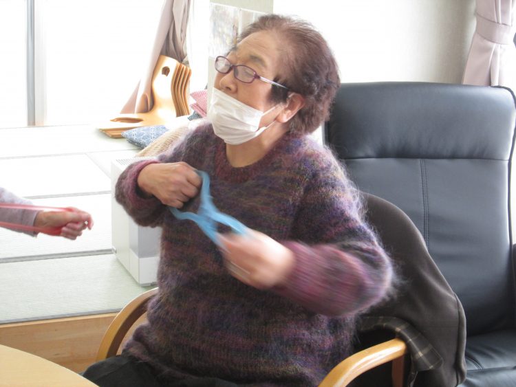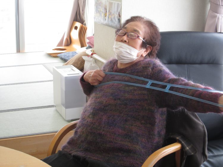ゴムバンドを使った上腕の訓練をしている K様