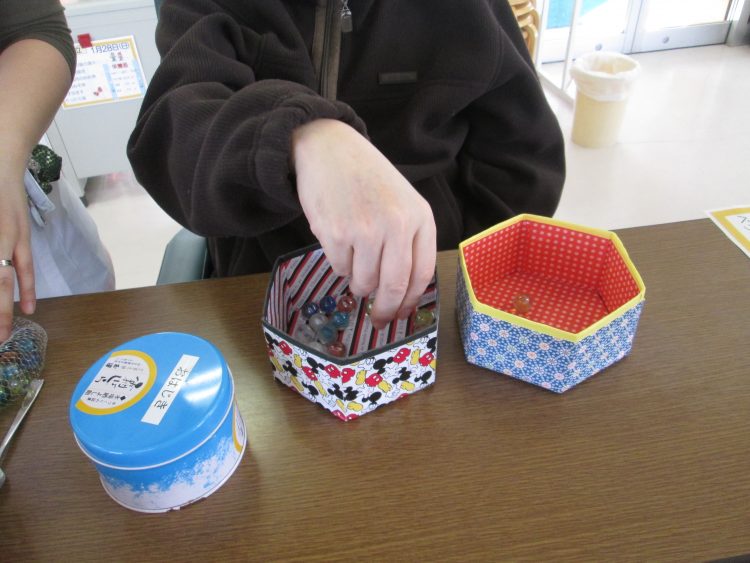次は、ビー玉移し N様には1つずつボー玉を移してもらいました。