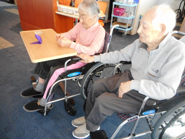 今日の午後は折り紙やつみき、パズルなどを行いました。M様が一生懸命折っていると、I様が「なに作っているの?」と不思議そうに見ておりました。