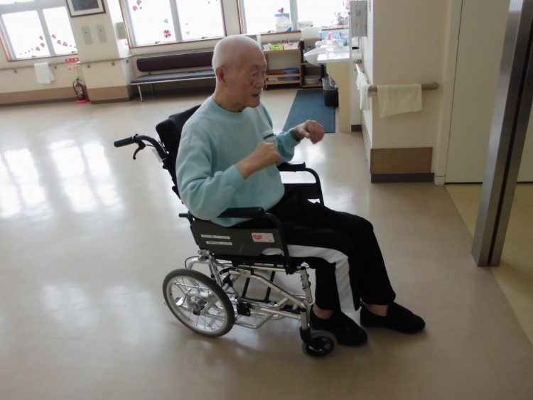 3階のお客様全員で曲に合わせて楽しく運動されており、リハビリの看護師とともに「えんやーこらや」と声を出しながら皆様笑顔で取り組んでいました。