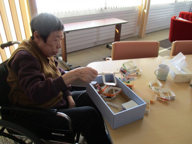 S様とN様はリハビリも兼ねて牛乳パックのジェンガを真剣に積み上げ楽しまれています。「家にある物で楽しく出来ていいな~」と笑顔で話をされていたS様。手を止めることなく楽しまれていました。N様「上手だな」とS様を見て話されています。