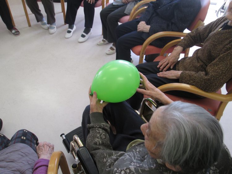 今日は風船バレーを行いました。まずは準備体操を行い、肩の運動を行いました。