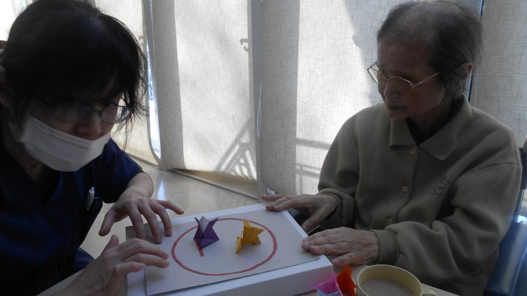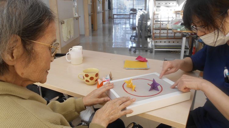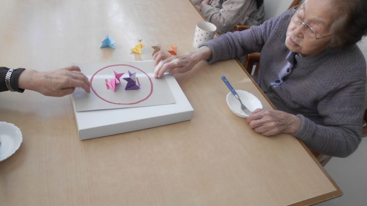 皆さん、箱をたたきながら上手に自分の折り紙力士を相手に近づけ、一生懸命倒そうと