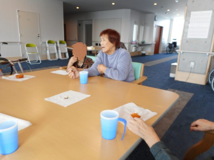 お茶会の際、お客様みんなでおやつとコーヒーを会話を楽しみながら召し上がっていました。