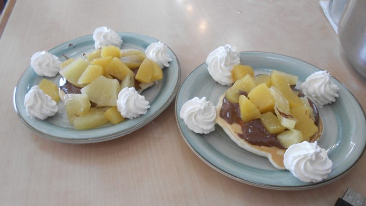 ホットケーキを焼いて、チョコレートをけて、缶詰をのせてー!