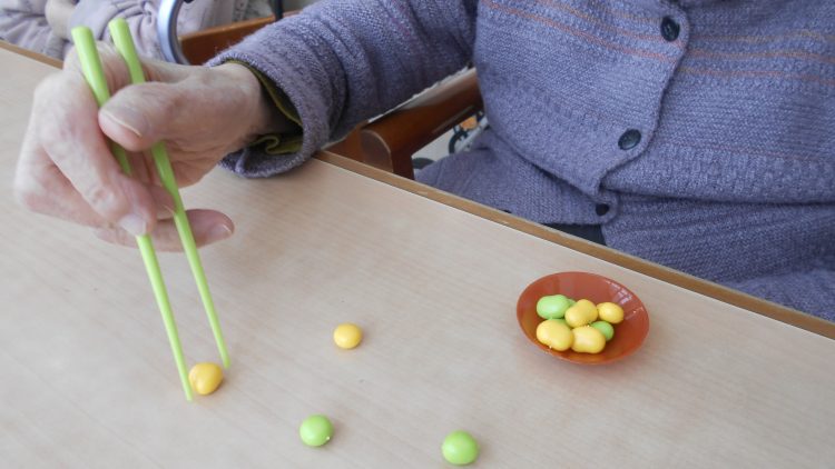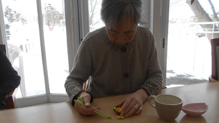 箸も豆もプラスチックなのでつるつる滑ってなかなか難しいんですよ。
