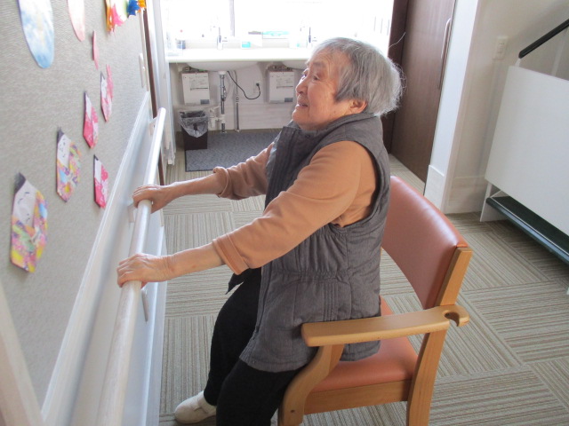 立ち上がり訓練を行っているのは、S様。他に杖での歩行訓練も行っています。