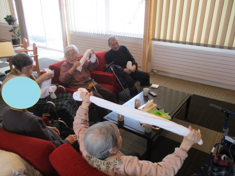昼食前に、皆さんでタオルを使った、肩こり体操の一部です。