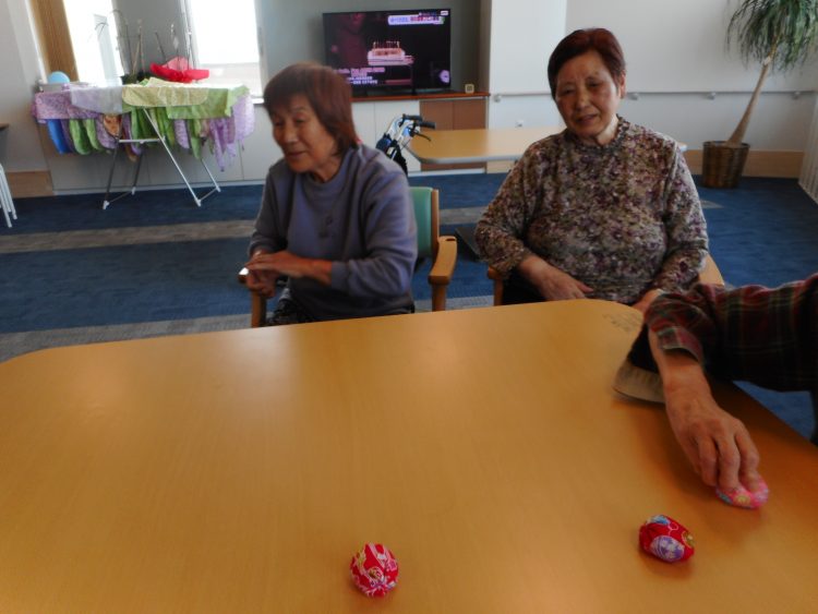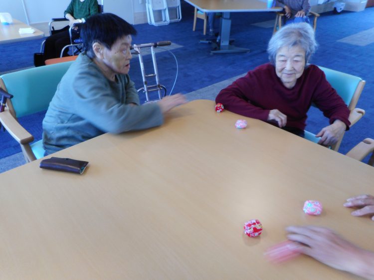 その後、お手玉を使ってテーブル上でのキャッチボール?を行いました。勢い余って落ちてしまったりしながら、皆様「わははは」と大きな声で笑い合いながら楽しんでらっしゃいました♪