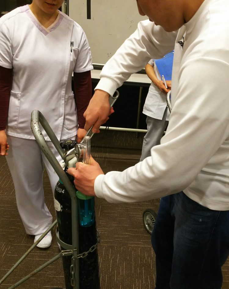 内容としては、酸素ボンベの使用方法等です。介護職員でも何かあった際は対応できなければいけないので、復習の意味も込めて参加している職員もいました。