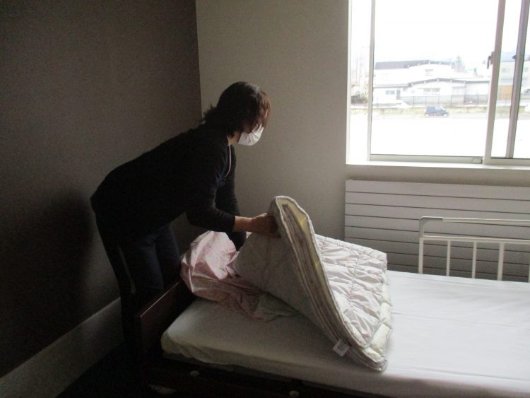 2階の居室では職員がシーツ交換を行っています。一つ一つ丁寧に行い、いつでも皆様が快適に過ごせる様心がけをしていきたいと思います。