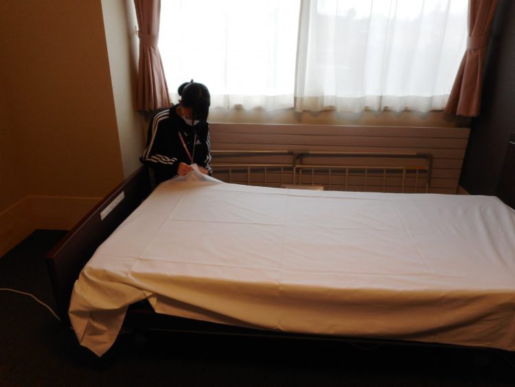 K介護員がシーツ交換を行っているところです。最初は、中々上手く出来なかったシーツ交換も、毎日体で覚えることで丁寧に・時間をかけずに出来るようになってきています。