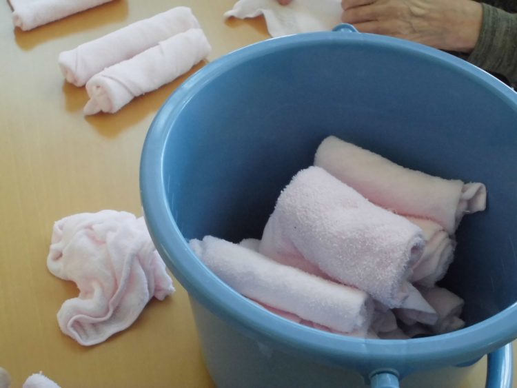 午前中のタオルたたみを手伝っていただいている風景です。写真には1名しか写っていませんが隣のベテラン