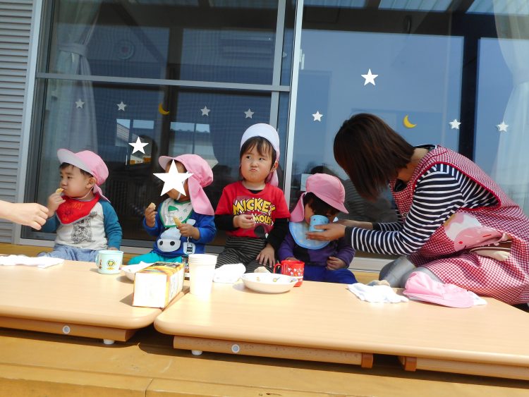 朝からとってもいい天気!!ぽかぽか陽気に誘われて、今日はテラスに出ておやつを食べました♪