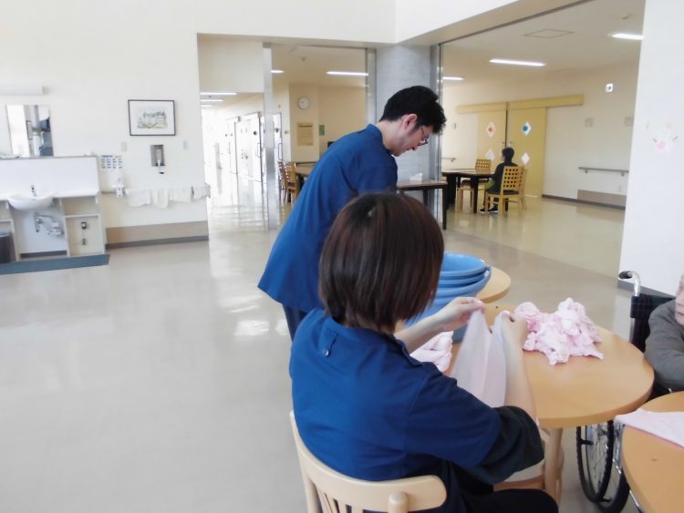 職員同士仲良くおしぼりたたみを行っています。毎日の日課ですので、お客様に手伝って頂いたりもします。会話をして行うと、楽しいものですね。これからも、職員同士、又は、お客様にも手伝って頂いて楽しく行っていきたいと思います。