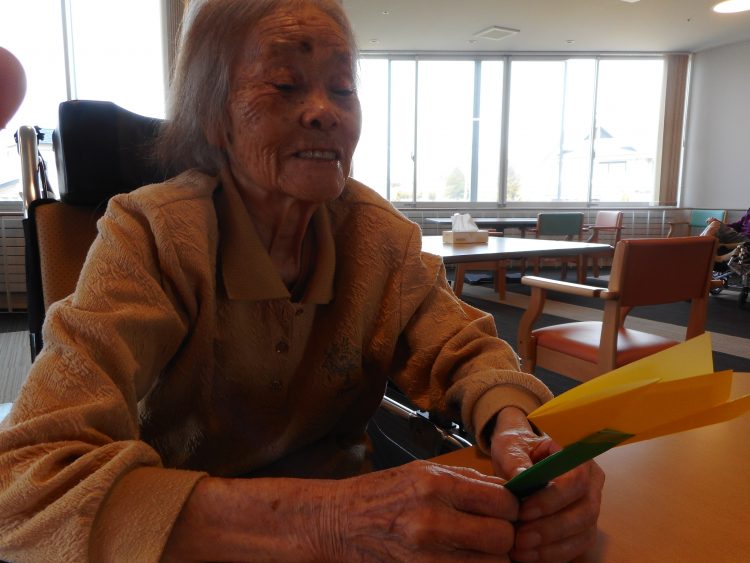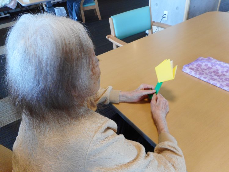 S様に「何に見えますか?」と職員が作ったチューリップを手渡してみると「なんだべー」と首をかしげてしまいました…