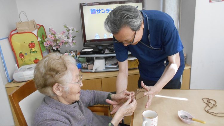 器用にお客様と代わる代わるあやとりを楽しんでいます。