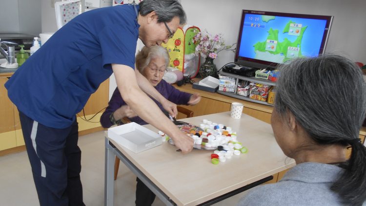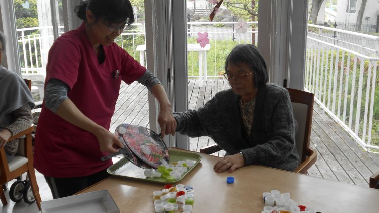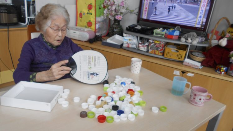 本日はコツコツと貯めてきたペットボトルのキャップを使って皆さまにレクレーションをしていただきました。