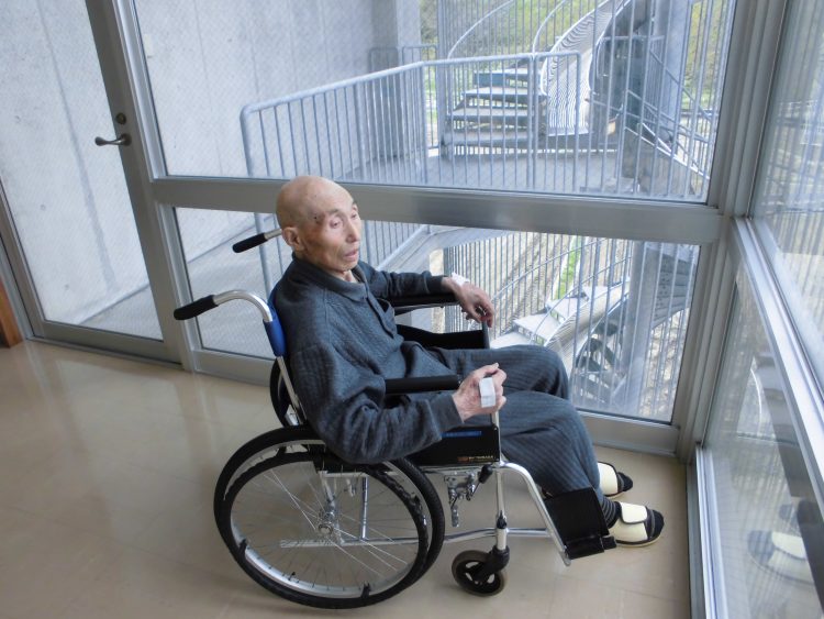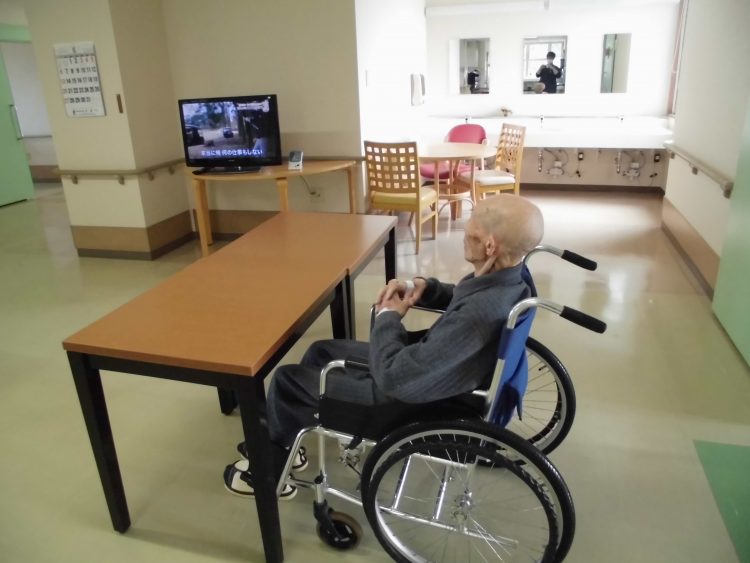みなさん、こんにちは。今日は、S様の朝の様子を紹介します。S様は、朝食が終わると、車椅子を自操しホールの端の方まで来て外の景色を眺めたり、ある程度ホ-ル内動いた後は、テレビ鑑賞され過ごされています。S様、いつまでもお元気でいて下さい。(ショ-トステイ E・H)