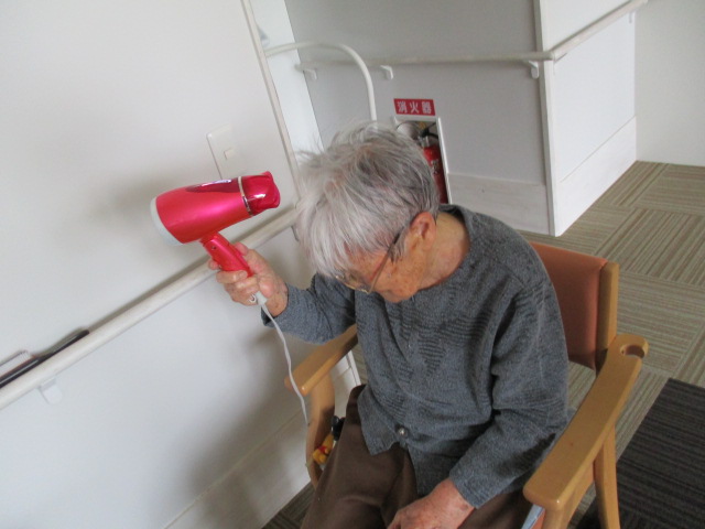 入浴後に「あーサッパリした!」「髪乾かしますか」の声掛けにチャレンジャーT様「自分でドライヤー使ってみる」と話され見守りでブローはカンペキ♪
